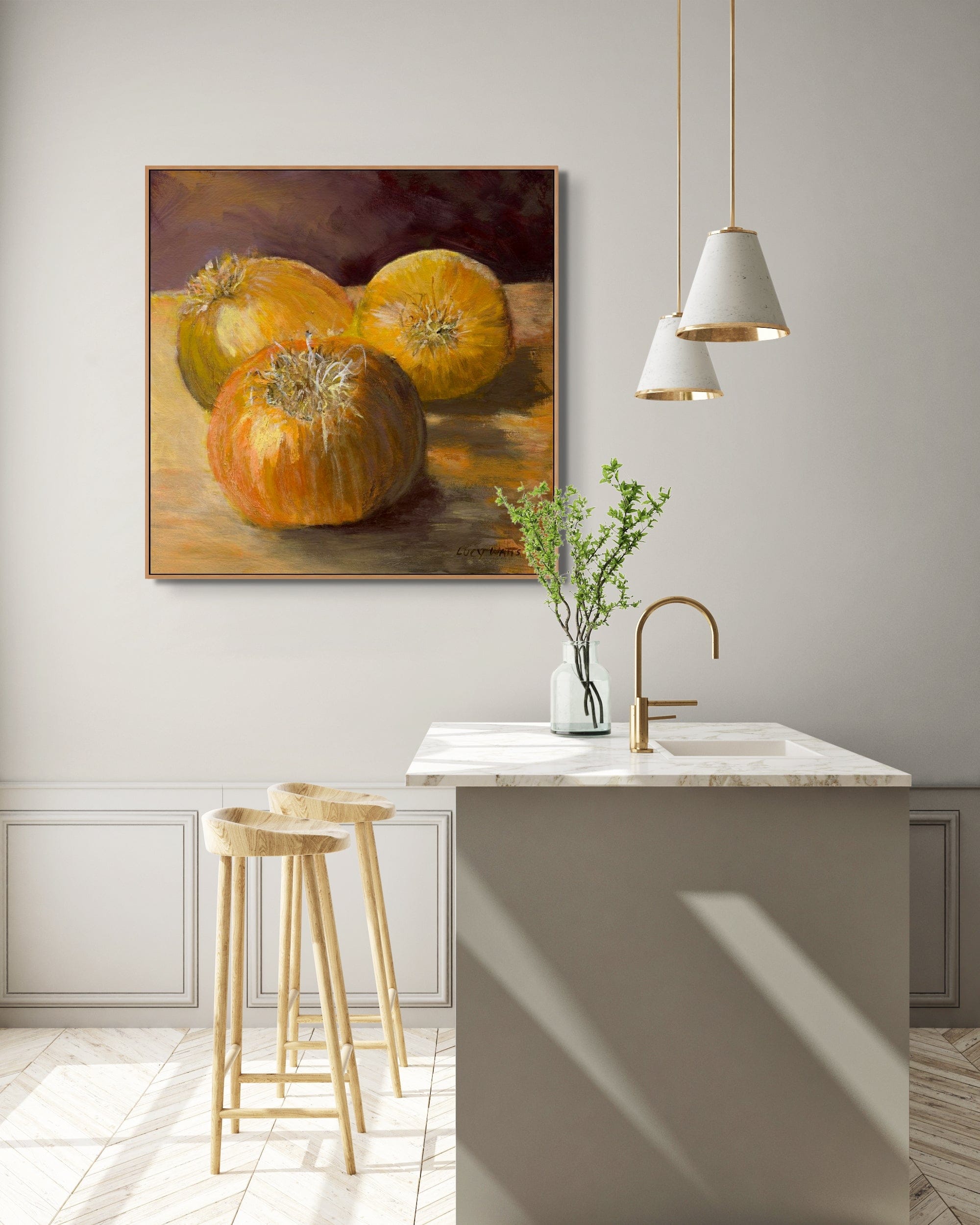 This is a limited edition giclee print of the original Lucy Watts painting 'Onions Three'. Lucy says, "I love the warm colours of brown onions and their papery covers. Their unique 'hairstyles' or tufts of roots add to their charm and personality as a subject. I really enjoyed painting these three".