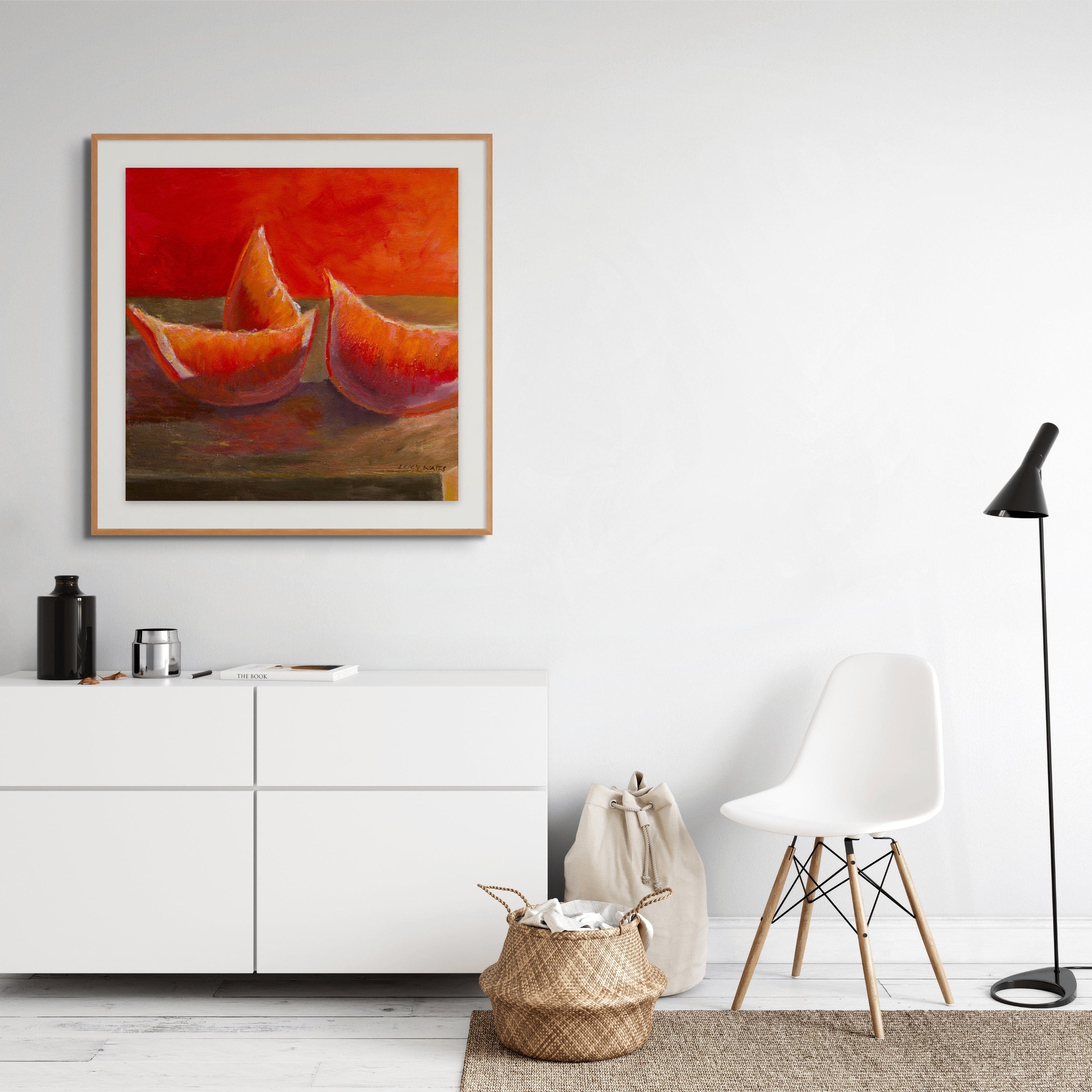 This is a limited edition giclee print of the original Lucy Watts painting 'Reclining Rubies'. Lucy says, "the deep oranges and pinks of a ruby grapefruit are especially fluid when sliced and placed near a light source. It's easy to feel inspired to reach for the brushes to record light, colour and juice at play".